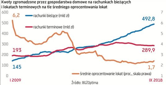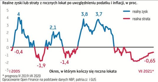 Zdaniem Bartosza Turka, analityka Open Finance, taka niekorzystna sytuacja może potrwać jeszcze trzy lata. W 2019 r. realne straty oszczędzających w bankach mogą być najwyższe od dekady, jeśli przeciętne oprocentowanie pozostanie na podobnym jak teraz poziomie, a inflacja przyspieszy, przekraczając 3 proc. Może być nawet tak, że inflacja roczna okaże się dwukrotnie wyższa od średniego oprocentowania 12-miesięcznych depozytów.