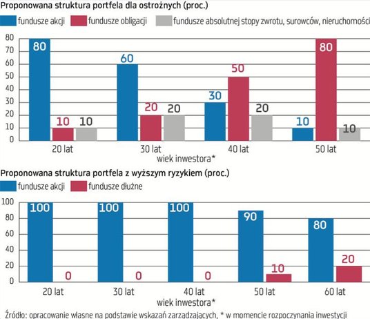 – Ktoś, kto dopiero wchodzi na rynek pracy i ma już pewien kapitał, zwykle jest w świetnej sytuacji – zauważa Adam Łukojć. Jego zdaniem taka osoba może inwestować z myślą o naprawdę długim okresie, a więc powinna wybrać fundusze akcji, najlepiej trzy lub cztery. – Optymalnie byłoby, gdyby każdy z tych funduszy działał na innym rynku. Jeśli będziemy mieli fundusze inwestujące w akcje np. w Polsce, Stanach Zjednoczonych, Europie Zachodniej i na rynkach wschodzących, to częściowo uodpornimy swój portfel na wahania koniunktury w poszczególnych krajach – twierdzi Adam Łukojć.