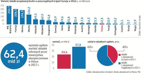 Według raportu Insurance Europe w 2016 r. najwięcej składek zebrały towarzystwa działające w Wielkiej Brytanii. Dalej uplasowały się: Francja, Niemcy i Włochy. Rzecz jasna nie bez znaczenia są w tym przypadku różnice w liczbie ludności (w Wielkiej Brytanii mieszka ponad 66 mln ludzi, a w Polsce niespełna 38 mln), ale suma składek na rynku brytyjskim (250,7 mld euro) dwudziestokrotnie przewyższa sumę składek zebranych w Polsce (zaledwie 12,3 mld euro). W 2017 r., według raportu Polskiej Izby Ubezpieczeń, wartość składek ubezpieczeniowych wyniosła u nas 62,4 mld zł, z czego ubezpieczenia na życie stanowiły prawie 40 proc., a ubezpieczenia majątkowe około 60 proc. W tej drugiej grupie dominują polisy komunikacyjne. W ubiegłym roku wpłacone tam składki sięgnęły 22,5 mld zł, podczas gdy składki we wszystkich innych rodzajach ubezpieczeń majątkowych – 15,3 mld zł.