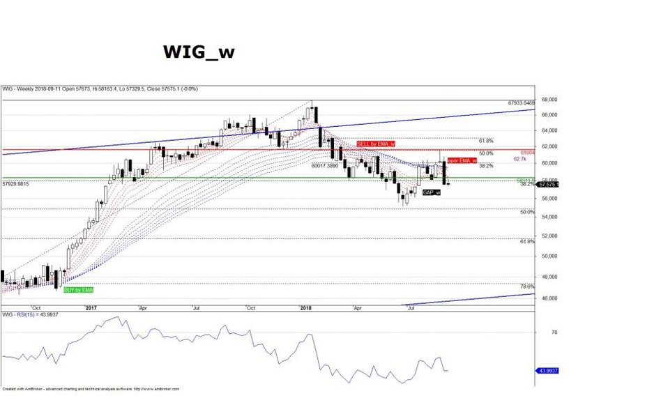 Zacznijmy od indeksu WIG. Mówiąc krótko – nie jest dobrze. Notowania w ujęciu tygodniowym odbiły się od 50-proc. zniesienia Fibonacciego i w ciągu dwóch tygodni spadły do 57 500 pkt. Czy to już koniec wakacyjnych zwyżek i wracamy do bessy?