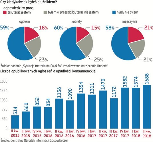 Centralny Ośrodek Informacji Gospodarczej podaje, że w drugim kwartale 2018 r. rekordowo dużo osób wystąpiło o ogłoszenie upadłości konsumenckiej. W tym czasie o umorzenie długów wnioskowało aż 1688 dłużników.