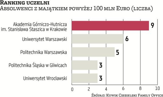Jedynie pięć uczelni w Polsce ma więcej niż trzech absolwentów z majątkiem przekraczającym 100 mln euro. Listę zamykają Politechnika Śląska w Gliwicach i Uniwersytet Wrocławski – mające po trzech multimilionerów. Karol Ciesielski przyznaje, że zaskoczeniem była dla nich przewaga uczelni technicznych jako kuźni multimilionerów. Tę prawidłowość związaną z transformacją gospodarczą widać także w zestawieniach uczelni – kuźni prezesów „Rzeczpospolitej" – tam również w czołówce dominują politechniki.