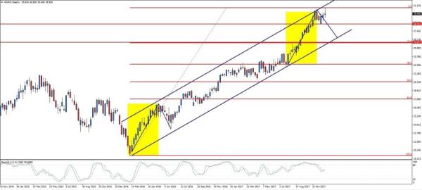 Na wykresie tygodniowym widzimy, że wzrosty kursu akcji zostały na chwilę wyhamowane. Na pewno doszło do częściowej realizacji zysków. Aby liczyć na dalsze wzrosty, byki muszą przełamać opór na poziomie szczytów 41 EUR. W takim przypadku celem będzie 45 EUR. Głębsza korekta nastąpi po przebiciu wsparcia 38 EUR. Jaki może mieć zasięg? Fala wzrostowa w 2016 r. (wzrost kursu o 35 proc.) zakończyła się 13-proc. korektą. Podobny ruch na północ miał miejsce w tym roku (również 35 proc. w górę). Jeżeli rynek wytraci impet i korekta się pogłębi, spadek cen akcji może sięgnąć poziomu ok. 35 EUR.