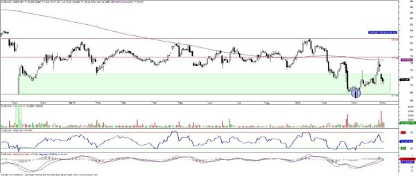 Na przełomie października i listopada notowania CVS powróciły w obszar oddziaływania wolumenowej strefy wsparcia. 6 i 7 listopada pojawiło się fałszywe przebicie, po czym kurs wystrzelił w kierunku długoterminowej średniej. Aktualnie notowania ponownie powróciły w niższe rejony. Wczoraj na wykresie wykształcił się biały popytowy młot, który od strony technicznej daje realną szansę na zakończenie korekty i wznowienie trendu wzrostowego. Bardzo mocnym argumentem przemawiającym na korzyść scenariusza aprecjacyjnego są wskazania analityków fundamentalnych. Niedowartościowanie względem konsensusu wynosi 20 proc., to na co warto jeszcze zwrócić uwagę, to fakt że aktualny kurs znajduje się poniżej najniższej wyceny. Podsumowując powyższe argumenty można postawić koncepcję wzrostową. Ze względu na początkowy etap potencjalnego trendu, poziomem SL należy umieścić na wysokości 66,43 w cenach zamknięcia.