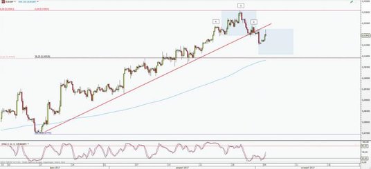 Co więcej, na razie w ogóle nie zanosi się, aby miało do tego dojść. Zdaniem Macieja Morawskiego, analityka TMS Brokers, sytuacja techniczna wskazuje bowiem na możliwość pogłębienia spadków, które pojawiły się na tej parze kilka dni temu. – Na wykresie 4-godzinowym EUR/GBP wyrysowała się formacja głowy z ramionami, oznaczająca możliwe zakończenie wzrostowej tendencji. Dodatkowo przełamana została średnioterminowa linia trendu, co zwiększa prawdopodobieństwo powrotu do spadków. Obecnie obserwujemy próbę wymazania części zniżki, jednak wzrostową falę należy traktować jedynie jako ruch korekcyjny – uważa Morawski. Do jakich poziomów może zejść EUR/GBP? – Celem niedźwiedzi będą okolice poziomu 0,91, gdzie wypada minimalny zasięg wynikający z formacji RGR korespondujący ze zniesieniami Fibonacciego 23,6 proc., 38,2 proc. oraz 200-okresową średnią kroczącą. Wcześniej warto zwrócić uwagę na piątkowe dołki wypadające w rejonie 0,9150. Zanegowaniem spadków będzie przełamanie poziomu prawego ramienia formacji przy 0,9240. W tym wypadku notowania z dużym prawdopodobieństwem przetestują szczyt ustanowiony 29 sierpnia przy 0,9308 – uważa analityk TMS Brokers. PRT
