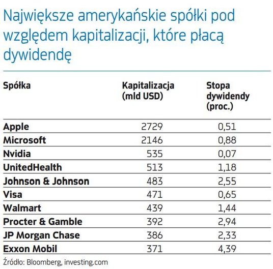 Dywidendą dzielą się jednak takie firmy jak Apple czy Microsoft. Stopa dywidendy w ich przypadku nie jest jednak wysoka i wynosi odpowiednio ok. 0,5 proc. i 0,9 proc. Wśród największych dziesięciu spółek, które płacą dywidendy, najhojniejszy jest ExxonMobil, który dzięki rosnącym notowaniom ropy jest w stanie wypłacać dywidendę, której stopa wynosi 4,4 proc.