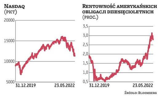 Nasdaq, z około 27-proc. stratą od początku roku, jest obecnie niemal najsłabszym indeksem akcji na świecie. Przyczyn słabości spółek technologicznych jest kilka, a głównym powodem zmiany nastawienia inwestorów jest zapewne rozpoczęty w tym roku cykl podwyżek stóp procentowych w Stanach Zjednoczonych. Inwestorzy obawiają się, że coraz wyższe w związku z tym koszty zadłużenia odbiją się na kondycji finansowej rosnących spółek. Z drugiej strony część zarządzających zwraca uwagę, że większość firm zaliczanych do kategorii growth nie ma problemów z zadłużeniem, a także jest w stanie wypracowywać solidne zyski. Najlepszym przykładem są oczywiście technologiczni giganci. Obie te koncepcje pokazują jednak, jak szeroki jest zakres pojęcia „growth". – Ważnym czynnikiem wpływającym na wyceny jest wzrost stóp procentowych na rynkach rozwiniętych. Przekłada się to na rosnącą stopę dyskontową i wpływa negatywnie na modelową wycenę spółek wzrostowych w raportach analitycznych – przyznaje Maciej Chudzik, zarządzający Investors TFI. Jak dodaje, powszechnie stosowany model bazuje na przepływach gotówkowych, a ze względu na fakt, że atutem spółek wzrostowych jest właśnie wysokie tempo wzrostu, wyższa stopa dyskonta znacząco obniża wycenę, nawet zakładając, że fundamentalnie w firmie nic się nie zmienia. Poza rozpoczętym cyklem podwyżek stóp procentowych, w ostatnich tygodniach doszły realne obawy o gospodarkę. Stagflacja stała się faktem, a po niej niestety często dochodzi do recesji.