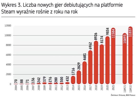 Kolejną niewiadomą jest sama kondycja rynku gier. Liczba nowych tytułów na Steam przez pierwsze 11 miesięcy tego roku wzrosła o 13 proc. rok do roku (Wykres 3) – przy spadku wydatków w sektorze w ujęciu globalnym. Jeżeli do liczby nowych gier debiutujących w 2021 r. doliczymy DLCs (płatne dodatki do istniejących tytułów), okaże się, że w każdy dzień roboczy na platformie Steam debiutowało średnio ponad 70 tytułów. To jasno pokazuje, jak trudna jest dzisiaj walka o uwagę gracza, który oprócz samych gier wideo ma do wyboru inne formy rozrywki, zarówno te cyfrowe, jak platformy streamingowe np. Netflix, jak i te bardziej tradycyjne.