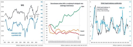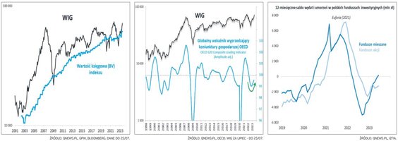 Jeśli jako najważniejszy barometr nastrojów rynkowych traktować saldo wpłat i umorzeń do funduszy akcji oraz mieszanych (inwestujących część portfela w akcje), to do niebezpiecznej euforii na krajowym rynku jeszcze daleka droga. 12-miesięczne saldo wpłat netto do funduszy mieszanych dopiero w czerwcu wyszło na plus, podczas gdy, dla porównania, na jesieni 2021 r. (poprzedni szczyt hossy) przekraczało +5,5 mld zł. Z kolei 12-miesięczne saldo nabyć i umorzeń w krajowych funduszach akcji jest ciągle głęboko na minusie (-1,3 mld zł po czerwcu wobec +7,1 mld zł w grudniu 2021 r.). Może dzięki lipcowej hossie napływy do funduszy zaczną się bardziej ożywiać?