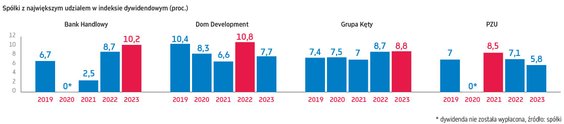 Jak dodaje, presja kosztowa, wzrost stóp procentowych czy po prostu gorsza koniunktura spowodowały, że część spółek musiała ograniczyć (np. KGHM) lub nawet zawiesić wypłacanie dywidendy (np. Cyfrowy Polsat). Na hojniejsze dywidendy muszą poczekać właściciele akcji banków. Choć instytucje te miały rekordowe marże odsetkowe, musiały się ograniczać z powodu zeszłorocznych wakacji kredytowych, wyroku TSUE i stanowiska regulatora.