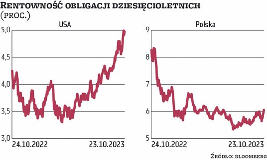 – Zachowanie obligacji w ostatnich tygodniach nie napawa optymizmem inwestorów zarówno w USA, jak i w Polsce. W obu przypadkach doszliśmy do „okrągłych” poziomów – zauważa Mariusz Zaród, zarządzający Quercus TFI. – Dziesięcioletnie amerykańskie treasuries płacą około 5 proc. w skali roku, a polskie dziesięciolatki – około 6 proc. To pokłosie wielu czynników, ale największą wagę przypisywałbym jednak rynkowi amerykańskiemu – zaznacza Zaród. Jak dodaje, to ten rynek od dawna nadaje ton, jeśli chodzi o zachowanie światowych aktywów. – Tegoroczna wyprzedaż spowodowana jest m.in. ogromnym deficytem budżetowym, który Departament Skarbu próbuje łatać, emitując co tydzień nowe obligacje. Brak popytu inwestorów azjatyckich (Chiny i Japonia), którzy zazwyczaj obejmowali sporą część aukcji, odbija się na cenach – tłumaczy ekspert Quercus TFI. Nie można zapominać także o postawie banku centralnego. Prezes Fedu Jerome Powell zapowiedział, że – wobec dobrych danych napływających z gospodarki – stopy procentowe zostaną utrzymane na dłużej na wysokich poziomach i na razie nie ma co myśleć o jakichkolwiek obniżkach. – Co więcej, podczas ostatniego posiedzenia poznaliśmy prognozy, które jasno wskazują, że w tym roku może dojść do jeszcze jednej podwyżki kosztu pieniądza – zauważa Zaród.