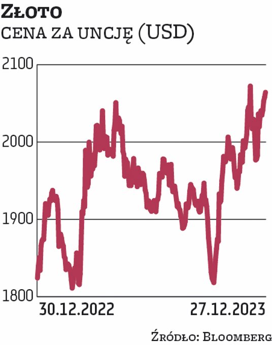 Cena uncji złota wzrosła od początku 2023 r. o nieco ponad 13 proc. i był to jej pierwszy roczny wzrost od trzech lat. Złoto radziło sobie w 2023 r. dużo lepiej od innych metali szlachetnych – srebro zyskało tylko 0,1 proc., platyna staniała o ponad 9 proc., a cena palladu spadła aż o 33,5 proc. Na korzyść złotego kruszcu działała polityka pieniężna Fedu, duża niepewność gospodarcza i geopolityczna oraz duże zakupy złota dokonywane przez banki centralne. Te czynniki przyczyniły się do tego, że 4 grudnia cena złota sięgnęła rekordowego poziomu 2135,39 USD za uncję. Czy po tak solidnych zwyżkach jest szansa na to, że kruszec mocno zdrożeje również w 2024 roku?