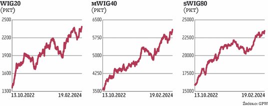 Dla utrzymania dalszych wzrostów kluczowe będzie jednak podłączenie się spółek indeksu WIG20, które w ostatnich 12 miesiącach notowały niższe zwyżki (około 23 proc. w porównaniu z 35 proc. indeksu szerokiego rynku, WIG).