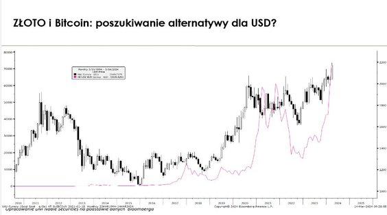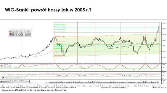 Patrząc fundamentalnie to rentowność kapitałów własnych banków na 2024 r. może wynieść blisko 16 proc., a na 2025 r. prawie 24 proc. Z tej perspektywy mamy powrót do bardzo wysokiej rentowności z 2007 r. Momentum jest mocne, ale już znane. Wydaje mi się, że jest w dużym stopniu zdyskontowane. Nowym czynnikiem byłoby zejście złotego do dolara poniżej 3,88. Wykres WIG-banki pokazuje, że mamy wieloletni trend boczny od 2007 r. Jest wybicie górą i opór na 13 tys. pkt. Jego przebicie otwierałoby potencjał do zwyżki, być może nawet pod 15,8 tys. pkt., ale tylko w momencie super hossy czy otoczenia bez czynników ryzyka. Pionowe kreski pokazują wykupienie na sochasticku, co zazwyczaj oznaczało schłodzenie (za wyjątkiem super hossy z 2005 r.). Czynnikiem niepewności jest sytuacja w Ukrainie, ryzyko geopolityczne (Chiny, Tajwan), wybory prezydenckie w USA. Czy wzrosty po ścianie strachu będą kontynuowane, byłbym ostrożny. Proponuję szukanie szans w tym, co do tej pory zachowywało się słabo, żeby zmniejszyć ryzyko portfela w średnim terminie. Na ten moment wykres banków wygląda pozytywnie, chociaż są wykupione, ale nie ma sygnałów sprzedaży.