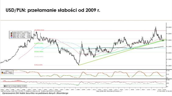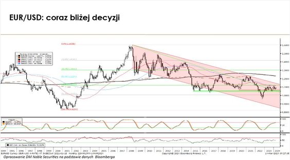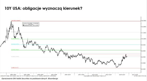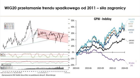 Siła banków może wspierać próbę wejścia na wyższe poziomy. Czynnikiem, który mógłby to determinować jest zachowanie amerykańskich indeksów akcyjnych. Kluczową kwestią jest polityka Fedu. Rynek zakłada pierwszą obniżkę stóp procentowych w USA w czerwcu. To by wspierało nasz indeks.