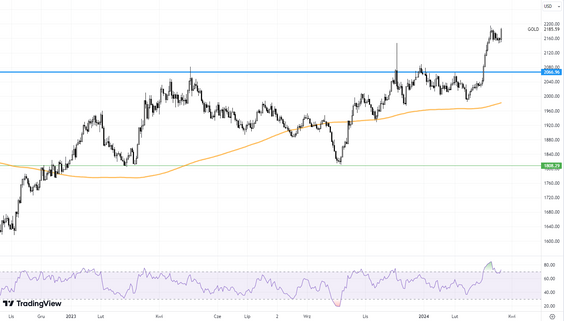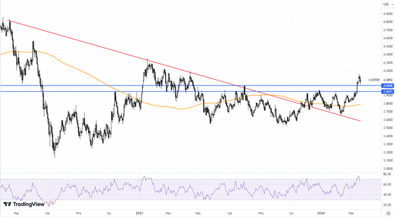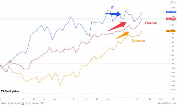 Retoryka Fedu była gołębia. Prognozy stóp procentowych, jakie widzą poszczególni członkowie Fedu na rok 2024, nie zmieniły się. Kilku „gołębich” członków podniosło swoje oceny, zatem średnia troszkę urosła, ale mediana pozostała bez zmian. To jest o tyle ważne, że jeśli skontrastujemy brak zmian w oczekiwaniach na obniżki stóp procentowych ze zmianami w prognozach gospodarczych, to otrzymamy pozytywny obraz. Fed na 2024 r. dosyć wyraźnie podniósł prognozy wzrostu w USA. Jeszcze w grudniu spodziewał się dynamiki PKB rzędu 1,4 proc., a teraz jest to 2,1 proc., więc to wyraźnie wyższa prognoza. Z kolei prognozy inflacji wyraźnie się nie zmieniły. Mimo oczekiwanego wyższego wzrostu gospodarczego prognozy inflacji nieznacznie się zmieniły, a równocześnie oczekiwania na obniżki stóp procentowych zostały utrzymane. Komentarze prezesa Powella były też dosyć gołębie. Ale zapewniał, że w razie czego Fed jest przygotowany do utrzymania stóp na wysokim poziomie przez dłuższy czas i obserwuje oczekiwania inflacyjne. Z drugiej strony inwestorzy widzą potencjał do obniżenia stóp przy obecnych prognozach gospodarczych. Powell wspomniał też, że Fed zaczyna się zastanawiać nad zmniejszeniem skali programu zmniejszania bilansu. Ogółem mamy zatem pozytywne informacje dla inwestorów.