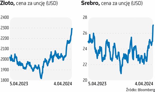 Cena uncji złota sięgała podczas czwartkowej sesji prawie 2305 USD i była rekordowo wysoka. Przez miesiąc wzrosła ona o ponad 8 proc., a przez 12 miesięcy zyskała 13 proc. Jeszcze mocniej zyskiwało w ostatnich tygodniach srebro. Jego cena wzrosła w ciągu miesiąca o ponad 13 proc., a w czwartek przekroczyła poziom 27 USD za uncję. Stała się najwyższa od czerwca 2021 r. Czy oba kruszce mogą jeszcze mocniej zdrożeć w nadchodzących miesiącach?