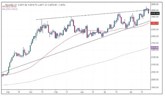 Złoto zrobiło się w tym roku modne głównie z powodu spadających rentowności obligacji. Rynek wierzy, że Fed coraz mocniej zbliża się do cięcia stóp procentowych. Takie też wnioski można wyciągnąć z opublikowanych w środę zapisków z posiedzenia Fedu, które wskazują, że wrzesień będzie początkiem cyklu luzowania. Rynek liczy, że pierwsze cięcie sięgnie 25 pkt baz., choć obniżka o 50 pkt baz. jest wyceniana z 38-proc. prawdopodobieństwem. Jak mówi Marek Rogalski z DM BOŚ, za tym drugim rozwiązaniem przemawiają przede wszystkim dane – te ostatnie oddaliły ryzyko recesji i podbiły scenariusz tzw. miękkiego lądowania. – Oczywiście, kolejne ważne publikacje są przed nami, ale nie wydaje się, aby do 18 września miało się coś „wywrócić” – zauważa.