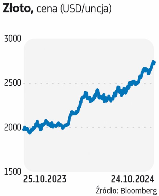 Złoto znów zaczęło rozpalać wyobraźnię inwestorów. Jego cena urosła od początku roku aż o 33 proc. i ostatnio bił rekord za rekordem. W tym tygodniu przebiła poziom 2750 USD za uncję. Paliwo do zwyżek dały jej zarówno bliskowschodnie napięcia geopolityczne, jak i oczekiwania inwestorów dotyczące polityki Fedu oraz innych banków centralnych. – Obecne środowisko to spadające stopy procentowe i rosnące ryzyko geopolityczne. Złoto korzysta z powodu obu tych czynników. 2800 USD za uncję dla złota wydaje się być rozsądnym poziomem na koniec roku – twierdzi Tim Waterer, główny analityk rynkowy w firmie KCM Trade.