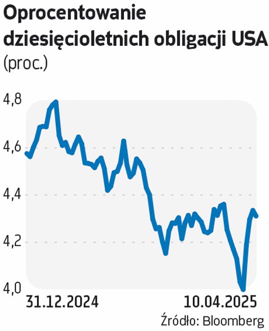 Trudno wskazać pozytywne efekty ekonomiczne dla USA, które miałyby przynieść ostatnie decyzje Trumpa. Analitycy jako powód zmiany decyzji o zawieszeniu ceł kierują wzrok na rynek obligacji. Przypomnijmy, że Trumpowi mocno zależy na zmniejszeniu kosztów obsługi zadłużenia. I rzeczywiście w poprzednim tygodniu ceny amerykańskich obligacji rosły (rentowność spadała), ale od początku tego tygodnia trend wyraźnie się odwrócił.