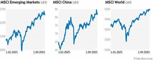 Indeks MSCI Emerging Markets zyskał już ponad 15 proc. od początku roku. Wszystkie poprzednie osiem miesięcy było dla niego wzrostowe. Wcześniej tak długie serie miesięcznych zwyżek zdarzyły się tylko dwukrotnie: w 2017 r. i w 1993 r. Do wzrostów doszło choć okres ten cechował się zwiększoną niepewnością dotyczącą choćby polityki handlowej USA, perspektyw dla gospodarki globalnej i podwyższonym ryzykiem geopolitycznym. Na rynkach wschodzących przeważał jednak optymizm. Zwyżki MSCI Emerging Markets napędzane były m.in. przez chińskie spółki. Indeks MSCI China (w którym dużo ważą firmy technologiczne z Państwa Środka) wzrósł w tym roku o 27 proc. Tymczasem ogólnoświatowy i obejmujący również rynki rozwinięte indeks MSCI World wzrósł od początku stycznia o ponad 12 proc