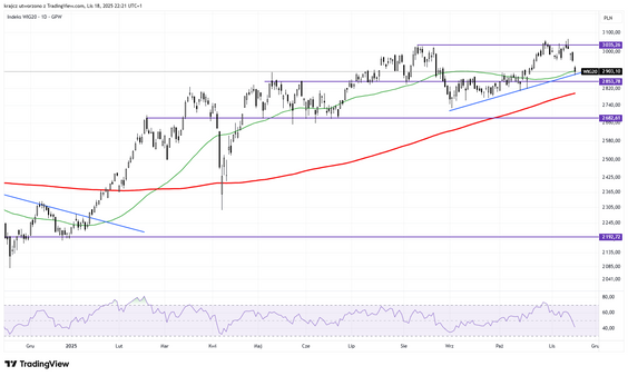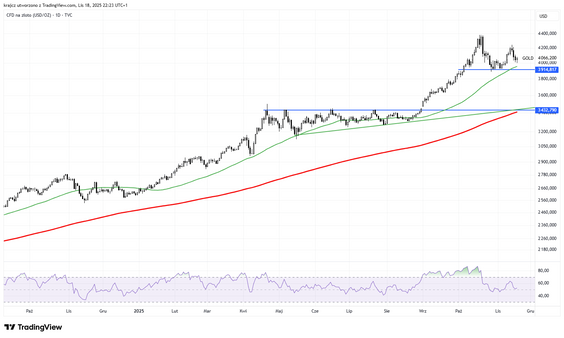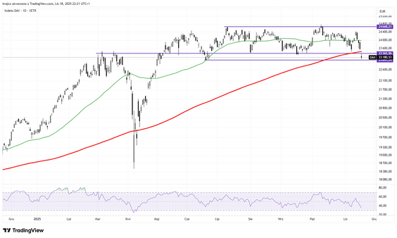 Moim zdaniem w okolicach 6200 pkt. znajduje się mocniejsze wsparcie dla S&P 500. W to miejsce dąży ta 200-sesyjna średnia krocząca. Na tym poziomie był też poprzedni szczyt indeksu na wiosnę tego roku. Ale wcześniej jest takie mniejsze wsparcie, gdzieś w okolicach 6600 pkt. Tam był lokalny dołek z początku października, ale też na tym połapie wypadały mniejsze szczyty z początku września. To poziom na którym indeks może się zatrzymać i odbić. Ale oczywiście są różne scenariusze korekty. Mówi się, że są fale ABC korekty. Teraz mielibyśmy falę A, potem byłoby jakieś odbicie, czyli fala B i jeszcze czekałaby ta większa fala spadkowa C do właśnie tych 6200 pkt. Zobaczymy jak będzie. Argumenty fundamentalne są pozytywne. W perspektywie kilku tygodni może być duża zmienności i na giełdach może bujać, ale generalnie końcówka roku czy pierwsza połowa 2026 r. naszym zdaniem powinna być pozytywna.