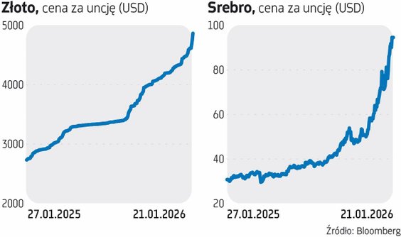 Złoto ustanawiało w środę, już kolejny dzień z rzędu, rekordy. Cena uncji tego kruszcu doszła do 4888 USD. Od początku roku urosła już o 13 proc., a w ciągu 12 miesięcy skoczyła o 77 proc. Mocno zyskało również srebro. Od początku stycznia zdrożało o 31,5 proc., a przez rok o prawie 205 proc. Za uncję tego metalu płacono w środę po południu 94 USD. Dzień wcześniej ustanowiła ona rekord cenowy na poziomie 95,8857 USD. Metale szlachetne zyskiwały w ostatnich tygodniach mocno na wartości, ze względu na podwyższone napięcia geopolityczne. Są uznawane tradycyjnie za aktywa z „bezpiecznej przystani”. Wzrost cen kruszców wspierany był też przez popyt generowany przez banki centralne, takie jak choćby Narodowy Bank Polski, który niedawno podjął decyzję o zwiększeniu rezerw złota do 700 ton (na koniec 2025 r. posiadał 550 ton kruszcu.).