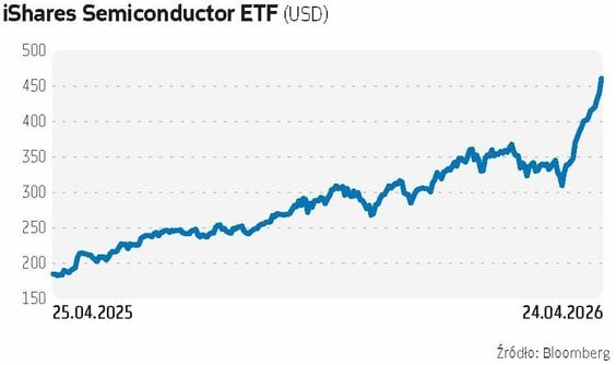 Spółki półprzewodnikowe przebudziły się w imponującym stylu. Po tym, jak w lutym i przez większość marca tkwiły w marazmie, chłodząc nastroje na amerykańskim rynku akcji, od kilku tygodni prują ku górze, napędzając zwyżki głównych indeksów. Przykładowo iShares Semiconductor ETF, mający pod zarządzaniem blisko 103 mld zł aktywów, rósł z rzędu przez 17 ostatnich dni. Choć rynek wygląda na rozgrzany do czerwoności, to wcale nie musi być to koniec świetnej passy. Optymistyczne nastawienie do producentów chipów czy procesorów podtrzymały czwartkowe wyniki Intela, którego notowania w handlu posesyjnym zwyżkowały nawet o ponad 20 proc. Jak wskazywali analitycy, wyniki Intela za I kwartał 2026 r. wzmocniły założenie o wychodzeniu spółki z wieloletniego okresu słabości operacyjnej. „Sam raport przyniósł solidne przebicie oczekiwań, ale jeszcze większe znaczenie mają prognozy na kolejne miesiące, które nadają całej publikacji wyraźnie bardziej wzrostowy charakter i stały się impulsem do dynamicznej reakcji kursu” – podało XTB. Przychody Intela sięgnęły 13,58 mld USD, tj. wzrosły o 7,2 proc. rok do roku, natomiast skorygowany zysk na akcję wyniósł 0,29 USD przy oczekiwaniach bliskich 0,01 USD. Uwagę inwestorów zwrócił nie tylko wzrost przychodów, ale przede wszystkim wzrost marży brutto do 41 proc., który sugeruje poprawę zarówno struktury sprzedaży, jak i efektywności kosztowej. „To sygnał, że działania podejmowane w ostatnich kwartałach zaczynają przekładać się na wymierne efekty finansowe” – wskazują analitycy. Głównym źródłem wzrostu Intela pozostaje segment baz danych i sztucznej inteligencji, mający za sobą 22-proc. wzrost rok do roku. „To potwierdza, że sztuczna inteligencja generuje już realny i rosnący popyt, szczególnie w obszarze infrastruktury serwerowej. Coraz większe znaczenie mają zastosowania związane z inferencją oraz rozwiązaniami bliżej użytkownika końcowego, co wzmacnia rolę CPU w całym ekosystemie” – komentują analitycy.