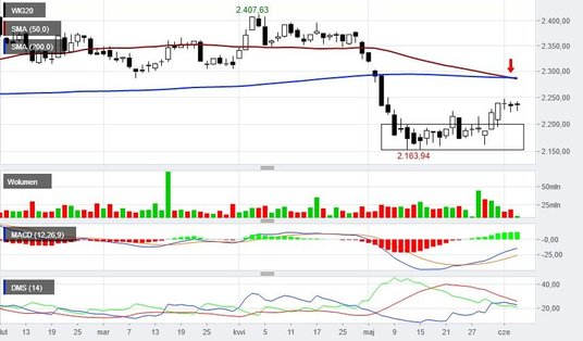 Warto zerknąć na sytuację techniczną głównych indeksów GPW. Zacznijmy od WIG20. Druga połowa maja upłynęła pod znakiem obrony wsparcia 2150 pkt. Ostatnie dni przyniosły nawet odbicie, ale niestety nie zostało ono potwierdzone obrotami. Co więcej – ostatnie świece dzienne to tzw. doji, które pokazują rynkowe niezdecydowanie i brak sił na kontynuację wzrostowego odreagowania. Do tego wszystkiego dochodzi formacja krzyża śmierci utworzona przez średnie kroczące z 50 i 200 sesji. Sygnał hossy z początku roku został tym samym zanegowany. Układ opór/wsparcie wygląda obecnie następująco 2250/2200 pkt. Przebicie górnej bariery powinno skutkować ruchem do 2290 pkt, gdzie znajduje się 200-sesyjna średnia. Spadek poniżej 2200 pkt da natomiast sygnał do spadku o co najmniej 50 pkt.
