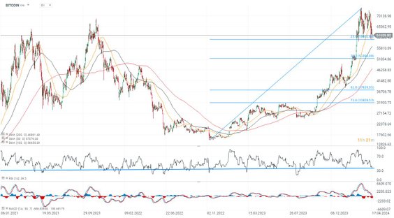 Wydaje się, że dotychczasowa 20% korekta jest już dość znacząca i w swojej dynamice zbieżna z poprzednimi, podobnymi do niej okresami spadków, z 2023 i początku 2024 roku. Wszystkie poprzednie okazywały się 'okazja do kupna'. Równie dobrze więc możemy obserwować wzrosty bezpośrednio po halvingu, lub na chwilę przed nim, choć popyt jak dotąd wygląda na uśpiony. Według analiz JP. Morgan rynek kontraktów terminowych wciąż sygnalizuje poziom wykupienia, a skorygowana o zmienność wycena BTC, w relacji do złota sugeruje cenę w okolicach 45,000 USD. Niemniej jednak w obu scenariuszach, początkową krótkoterminową reakcję możemy uznać za nieistotną dla dalszego (wzrostowego) trendu i oczekiwać zdecydowanie wyższych cen Bitcoina w horyzoncie kilku miesięcy, od halvingu.