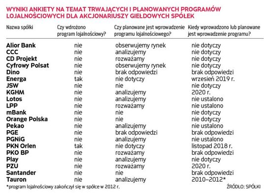 Spośród największych firmy notowanych na GPW program lojalnościowy dla swoich akcjonariuszy prowadzą obecnie tylko dwie spółki. Rok temu zainaugurował go PKN Orlen, a we wrześniu tego roku Energa. Płocki koncern w pierwszym etapie programu „Orlen w portfelu" zaproponował akcjonariuszom posiadającym przez co najmniej miesiąc minimum 50 akcji spółki rabaty na paliwa i ofertę pozapaliwową na prawie 1,8 tys. krajowych stacji. Od tego czasu na udział w nim zdecydowało się ponad 2,5 tys. osób. Z kolei wiosną koncern ruszył z Akademią Inwestowania, programem edukacyjnym, z którego mogą skorzystać wszyscy chcący poszerzyć swoją wiedzę o rynku kapitałowym i bezpiecznym inwestowaniu na giełdzie.