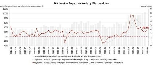 Indeks Popytu na Kredyty Mieszkaniowe w listopadzie urósł o 28,1 proc., co oznacza, że w przeliczeniu na dzień roboczy, banki i SKOK-i przesłały do BIK zapytania o kredyty mieszkaniowe na kwotę wyższą o 28,1 proc. w porównaniu do listopada 2020 r. – wynika z danych Biura Informacji Kredytowej. To wciąż wysokie tempo, w październiku indeks urósł o 19 proc., w sierpniu o 25 proc., w lipcu o 46 proc.