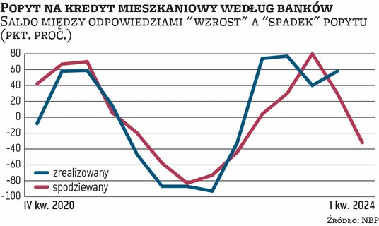 Po doskonałym pod względem rosnącej sprzedaży kredytu mieszkaniowego IV kwartale minionego roku, w I kwartale 2024 r. banki spodziewają się odwrócenia trendu i znacznego spadku popytu na te kredyty – wynika z cokwartalnej edycji badań NBP „Sytuacja na rynku kredytowym”.