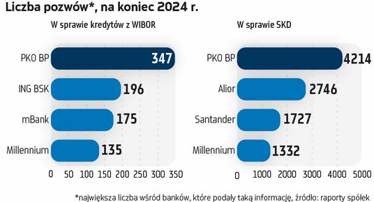 I choć sama ta liczba nie wydaje się nadmiernie duża, niepokojąca jest dynamika napływu nowych roszczeń od klientów. Przykładowo, przeciw PKO BP toczyło się 4,21 tys. spraw na koniec minionego roku wobec ok. 1,16 tys. na koniec 2023 r., przeciwko Millennium – odpowiednio 1,33 tys. i 0,42 tys., a przeciwko Aliorowi – 2,75 tys. wobec 1,22 tys. rok wcześniej.