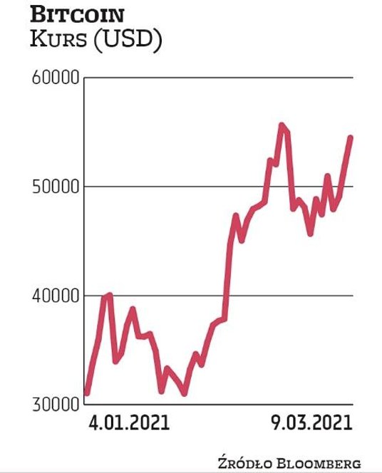 Notowania bitcoina rosły podczas wtorkowego handlu o 5 proc., do około 54,5 tys. USD. Mimo że do rekordowego poziomu 57,5 tys. USD nadal brakuje kilku tysięcy, najpopularniejsza kryptowaluta odbiła już o 25 proc., od końca lutego. Stopa zwrotu od początku roku wynosi blisko 90 proc., a za ostatni rok 580 proc.