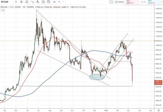 Dzienne minimum bitcoina to 5568 USD, co oznacza, że kurs znalazł się najniżej od maja ubiegłego roku. Po drodze pękło wsparcie na 6500 USD, wyznaczone przez formację podwójnego dna z przełomu roku. Sytuacja jest bardzo dynamiczna i niewykluczone, że zostaną podjęte próby powrotu nad ten pułap. W obliczu paniki, zawsze znajduje się kapitał, który łapie spadające noże. Widzieliśmy to kilka dni temu chociażby na rynku ropy naftowej, która przecież w porywach notowała ponad 30-proc. przecenę. To co dzieje się dziś na rynku kryptowalut przypomina to, co od kilku tygodni obserwujemy na rynkach akcji. Kapitał ucieka od ryzykownych aktywów, powodując gwałtowne przeceny. Cyfrowe pieniądze nie należy do najbardziej płynnych aktywów finansowych, więc o jego przecenę jest jeszcze łatwiej.