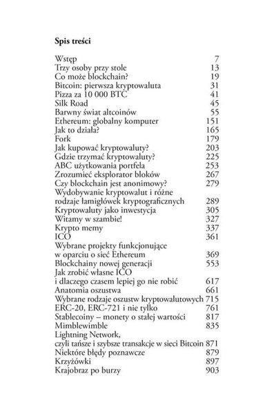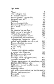W związku z tym, że świat kryptowalut i technologii blockchain dynamicznie się zmienia, przyszedł czas na drugie wydanie. Książka będzie liczyć aż 903 strony i 32 rozdziały (dokładny spis treści na zdjęciu). Co nowego się pojawi? - Doszło kilka nowych większych sekcji, czyli rozdziały dotyczące wybranych rodzajów oszustw kryptowalutowych, stablecoinów, Mimblewimble oraz Lightning Network. Rozbudowany został również rozdział dotyczący altcoinów oraz w książce znalazło się kilka poprawek i aktualizacji – czytamy na profilu książki na Facebooku. - Już w czwartek 5 marca o godzinie 18:00 spotkamy się w przestrzeni RBL_ Alior Banku w Warsaw Spire na oficjalnej premierze publikacji. Zadbamy o to, żeby nikt nie wyszedł z wydarzenia bez swojego egzemplarza – zaprasza na Facebooku Krzysztof Bielecki. Oto link do wydarzenia: https://www.facebook.com/events/496844577695359/