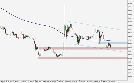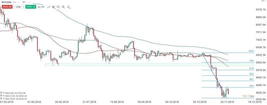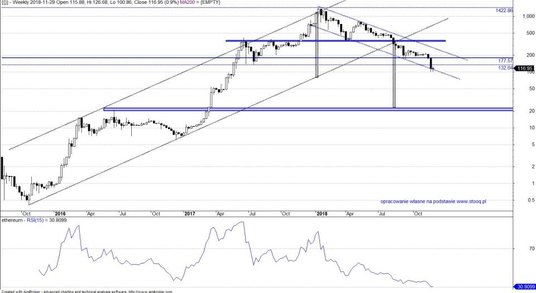 Po wybiciu 6000 USD bitcoin kontynuuje spadki w zastraszającym tempie. Co prawda potencjalnym zasięgiem wybicia z formacji trójkąta zniżkującego, która ukształtowała się na przestrzeni roku są nawet poziomy poniżej 1000 USD, to próżno na razie szukać okazji do głębszego odbicia. Dynamika ruchu bez wątpienia przypomina skalę z jaką mieliśmy do czynienia przy szaleńczej hossie w 2017 r. a jak wiadomo spadki są zawsze szybsze od wzrostów. W połowie tego tygodnia obserwowaliśmy próby odbicia, jednak zatrzymały się one w okolicach zniesienia 23,6 proc. fali spadkowej od początku listopada, a po ukształtowaniu czwartkowych szczytów, obserwujemy powrót do głównego trendu. Jeśli ostatnie minima zostaną wybronione, to istnieje możliwość większego odreagowania, nawet w okolice psychologicznych 5000 USD, gdzie znajduje się zniesienie 50 proc. Takie wzrosty nie zamażą jednak niedźwiedziej wymowy ostatnich tygodni, a spadki w średnim terminie powinny być nadal kontynuowane