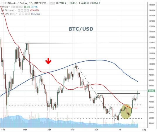 Trwa dobra passa bitcoina. Od końca czerwca jego kurs wzrósł z okolic 6000 USD do ponad 8000 USD. To oznacza zwyżkę o ponad 30 proc. Jego kapitalizacja, według portalu coinmarketcap.com sięgnęła we wtorek w południe 137,6 mld USD, co oznaczało 46,7-proc. udział w kapitalizacji całego rynku cyfrowych walut. Dla porównania – jeszcze w maju, gdy bitcoin ustanawiał tegoroczny dołek udział ten wynosił 10 pkt proc. mniej. Możliwe przyczyny trwającego wzrostu opisywałem w ostatni piątek na łamach parkiet.com w artykule: http://www.parkiet.com/Kryptowaluty/307209969-Bitcoin-23-proc-w-gore.html&template=restricted