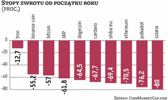 W listopadzie cena najpopularniejszej cyfrowej waluty sięgnęła rekordowych ponad 68 tys. USD. Z kolei na początku lipca wyznaczono dołek obecnej bessy poniżej 19 tys. USD. Również w środę, po wysokim odczycie inflacji CPI w USA, która zaważyła na nastrojach inwestorów, notowania bitcoina na krótko zeszły poniżej 19 tys. USD. W czwartek cena oscylowała wokół 20 tys. USD.
