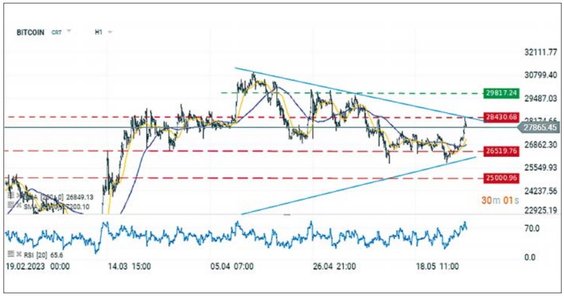 Ciekawie przedstawia się także sytuacja techniczna na wykresie bitcoina. – Cena jest w okolicach linii oporu na poziomie 28 000 USD, po tym jak wcześniej została odrzucona od linii wyznaczającej średnioterminowy trend spadkowy w okolicach 28 400 USD. Jeśli strefa oporu zostanie przełamana, w najbliższym czasie możliwy jest test kluczowego poziomu w okolicach 30 000 USD. Jeśli cena nie przekroczy 28 400 USD, następny poziom wsparcia można znaleźć w okolicy 26 500 USD. Wskaźnik RSI pokazuje, że bitcoin jest nieco wykupiony, jednak odczyt wskaźnika ochładza się, podczas gdy cena pozostaje nadal wysoko – twierdzą eksperci XTB.
