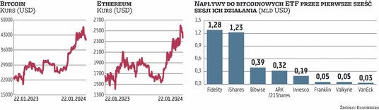 W poniedziałek po południu za 1 bitcoina płacono około 40,8 tys. USD, czyli o prawie 3 proc. mniej niż na początku roku oraz o 17 proc. od szczytu z 11 stycznia, czyli od dnia po tym, jak amerykańska Komisja Papierów Wartościowych i Giełd (SEC) zatwierdziła pierwsze ETF-y oparte na spotowym kursie bitcoina. To nadzieje związane z powstaniem tych funduszy mocno przyczyniły się do tego, że bitcoin zyskał w 2023 r. aż 157 proc. wobec dolara. Po samym zatwierdzeniu bitcoinowych ETF-ów na rynku kryptowalut doszło jednak do korekty, którą częściowo można tłumaczyć realizacją zysków przez inwestorów.
