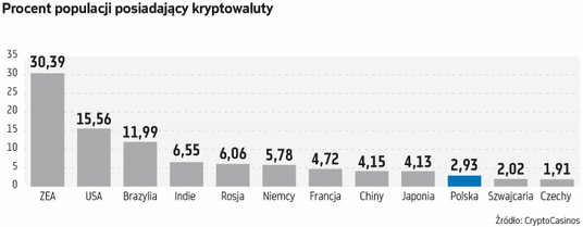 Kryptowaluty są fenomenem globalnym, ale oczywiście w różny sposób traktowanym w poszczególnych państwach. W niektórych krajach – na przykład w Algierii, Bangladeszu, Nepalu czy w Chinach – transakcje z udziałem kryptowalut są formalnie nielegalne, co jednak nie oznacza, że do nich nie dochodzi. Na drugim biegunie znajduje się Salwador, gdzie bitcoin jest oficjalnym środkiem płatniczym, a państwo inwestuje w tę krytpowalutę i zachęca kryptowalutowych biznesmenów z całego świata, by wybrali ten kraj jako miejsce swojej działalności. To, na ile dany kraj jest przyjazny wobec walut cyfrowych, zależy jednak nie tylko od regulacji. Ważne jest też to na ile wirtualne waluty są tam popularne, czy posiada je znacząca część miejscowych inwestorów i to, czy można tam stosunkowo tanio wydobywać bitcoiny. Portal CryptoCasinos, opierając się na tych wskaźnikach, stworzył ranking krajów najbardziej przyjaznych wobec wirtualnych walut. Polska znalazła się w nim na 26. miejscu. Z danych zebranych dla tego zestawienia wynika, że kryptowaluty posiada w naszym kraju 2,9 proc. populacji, co jest wynikiem zbliżonym do średniej światowej (3 proc.). Nie opłaca się u nas jednak wydobywać bitcoinów. Koszt „wykopania” 1 BTC wynosi bowiem prawie 87,9 tys. USD, czyli traci się ponad 20 tys. USD na wydobyciu jednej sztuki. Daleko więc na pod tym względem choćby do Argentyny, gdzie na „wykopaniu” 1 BTC zarabia się ponad 51 tys. USD.