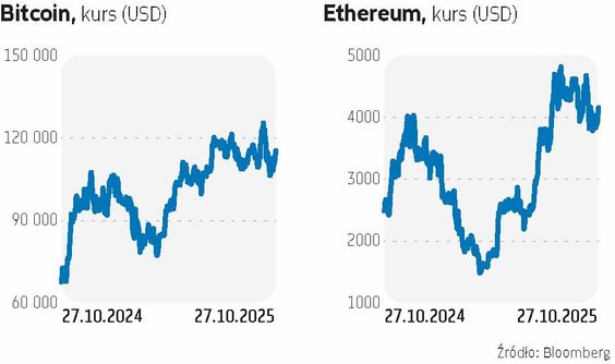 Za 1 bitcoina płacono w poniedziałek po południu ponad 115 tys. USD, czyli o ponad 5 proc. więcej niż miesiąc wcześniej. Październik był bardzo burzliwym miesiącem dla tej kryptowaluty. O ile 8 października notowania bitcoina doszły (według danych agencji Bloomberga) do rekordowych 126,251 USD, to w dołku z 17 października były one nieco poniżej 105 tys. USD. Przecena była wywołana strachem przed zaostrzeniem amerykańsko-chińskiej wojny handlowej. Ostatnie dni przyniosły jednak więcej optymizmu na rynkach, m.in., gdyż wzrosły szanse na porozumienie USA z Chinami. Notowania bitcoina wróciły więc na poziom sprzed około dwóch tygodni. Podobnie zachowywał się kurs etheru (ethereum), kryptowaluty drugiej pod względem popularności. W szczycie z tego miesiąca sięgał on prawie 4660 USD, a w dołku 3474 USD. W poniedziałek po południu za 1 ether płacono natomiast 4153 USD. W ciągu miesiąca ta kryptowaluta zyskała ponad 4 proc., od początku roku blisko 25 proc., a przez ostatnie 12 miesięcy 67 proc. Bitcoin zdrożał natomiast od początku stycznia o 23 proc., a przez rok zyskał prawie 65 proc. Na korzyść kryptowalut mocno działały w tym roku korzystne dla nich zmiany regulacyjne w USA i związana z tym szersza adaptacja wirtualnych aktywów w głównym nurcie finansowym. O tym, że ów główny nurt patrzy coraz bardziej przychylnie na kryptowaluty, świadczą choćby plany banku JPMorgan Chase.