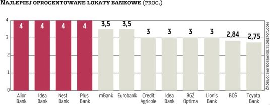 Wciąż najlepiej oprocentowane są cztery lokaty – każda w wysokości 4 proc. Najlepsze warunki oferuje Idea Bank – dwumiesięczna lokata Happy (do 10 tys. zł) jest przeznaczona dla nowych klientów, ale nie trzeba spełniać innych warunków, przede wszystkim zakładać konta. Jednak, jak wynika z nieoficjalnych informacji, bank zamierza obniżyć jej oprocentowanie. Kiedy i o ile – nie wiadomo. Pozostałyby zatem trzy. Wśród nich najkorzystniejsza jest Nest Lokata Witaj – 4 proc. na trzy miesiące dla kwot do 10 tys. zł. Wprawdzie trzeba założyć konto, ale rachunek w tym banku, a także karta do niego, są całkowicie bezpłatne. Lokata w Alior Banku (4 proc. na dwa miesiące do 10 tys. zł) przeznaczona jest dla osób otwierających Konto Wyższej Jakości, Rozsądne lub Internetowe. Tu też można uniknąć opłat – Konto Internetowe prowadzone jest za 0 zł bez warunków – ale tylko bez karty płatniczej. Konta wymaga również Lokata na Start w Plus Banku, ale tu rachunek kosztuje 9 zł, chyba że wykona się kartą transakcje na minimum 500 zł. To zatem rozwiązanie dla osób, dla których będzie to główne konto, a nie dodatkowe.