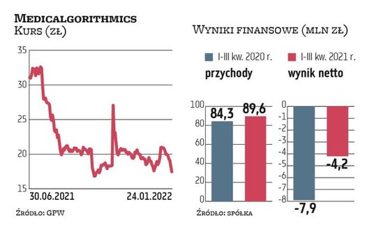 W trakcie poniedziałkowej sesji akcje Medicalgorithmics traciły nawet 8 proc. Była to dla nich już piąta spadkowa sesja z rzędu. Spadki przyspieszyły w ostatnich dniach, gdy stało się jasne, że twórca InPostu nie wesprze kapitałowo spółki. Rafał Brzoska uznał, że warunki biznesowe transakcji, jak również obecny moment cyklu gospodarczego oraz zwiększona zmienność na rynków finansowych nie dostarczają wystarczających powodów co do kontynuacji negocjacji nad przeprowadzeniem potencjalnej transakcji. Zarząd Medicalgorithmics liczył się z takim scenariuszem i dlatego kontynuuje proces przeglądu opcji strategicznych oraz działania nakierowane na rozwój sprzedaży celem wyprowadzenia firmy na prostą. Zmiany jej modelu biznesowego dotychczas nie przynosiły oczekiwanych efektów w postaci poprawy rentowności i płynności. W grudniu spółka pozyskała z emisji nowych akcji prawie 11,7 mln zł. Pozyskanie środków jest jednym z kroków do celu poprawy efektywności spółki zależnej Medi-Lynx, generującej największe przychody w grupie, m.in. poprzez mocniejsze doinwestowanie sieci sprzedaży w USA i na nowych rynkach i szybszy wzrost wolumenu badań.