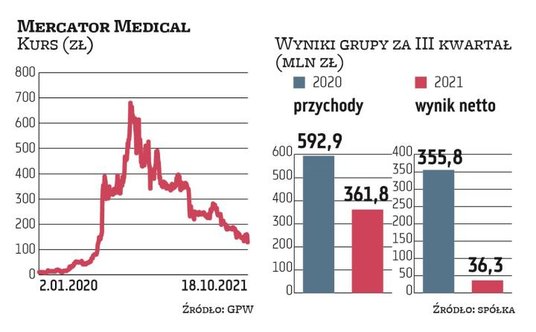 Notowania spółki Mercator Medical 12 miesięcy temu wyznaczyły historyczny szczyt, przebijając poziom 700 zł. Od tego czasu dominuje trend spadkowy. Poniedziałkową sesję kurs zaczął od mocnej zniżki, a w kolejnych godzinach przecena jeszcze się pogłębiła. Po południu kurs wynosił 126,8 zł (-19 proc.). Jest najniżej od lipca zeszłego roku.
