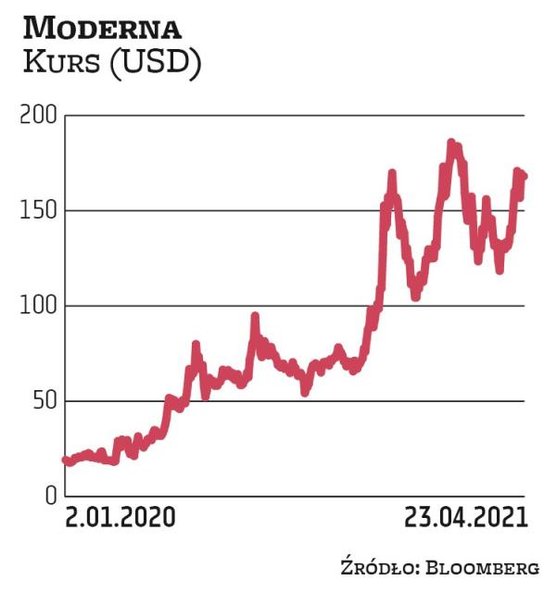 Akcjonariusze notowanej na Nasdaqu Moderny mają powody do zadowolenia. Stopa zwrotu w ubiegłym roku wyniosła około 450 proc. Po korekcie z grudnia akcje znów wróciły do trendu wzrostowego i w lutym zdrożały do najwyższego poziomu w historii. Mimo że obecnie akcje są 10 proc. poniżej szczytu, to od początku roku i tak zyskały 60 proc. dos