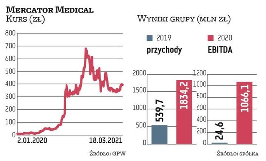 Po sesji 19 marca Mercator Medical awansuje do WIG20. W czwartek kurs akcji producenta m.in. rękawic chirurgicznych i ochronnych utrzy-mywał się na stabilnym poziomie w okolicach 392 zł, co implikuje kapitalizację wynoszącą 4,1 mld zł.