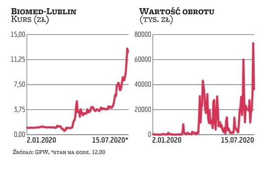 Notowania Biomedu od kilku miesięcy idą mocno w górę. Widać też wzmożone obroty. Przybrały one na sile w ostatnich dniach. We wtorek właściciela zmieniły akcje o wartości przekraczającej 70 mln zł, a w środę – tylko w pierwszej połowie sesji – wartość obrotu sięgnęła imponującego poziomu 40 mln zł. Biotechnologiczna spółka cieszyła się większym zainteresowaniem inwestorów niż tacy giganci jak KGHM czy PKO BP.